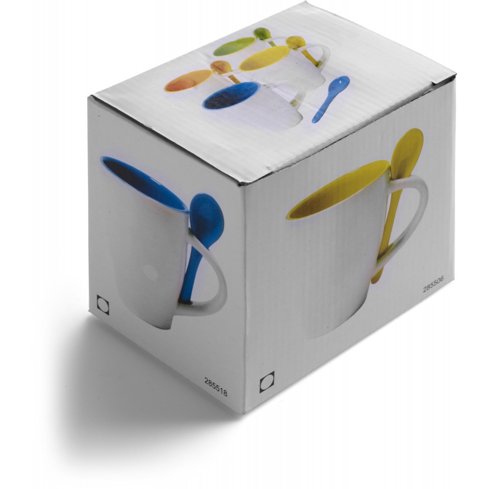 Kerámia bögre kiskanállal, 260 ml. Mosogatógépbe és mikrohullámú sütőbe helyezhető. A dobozt tartalmazza az ár.