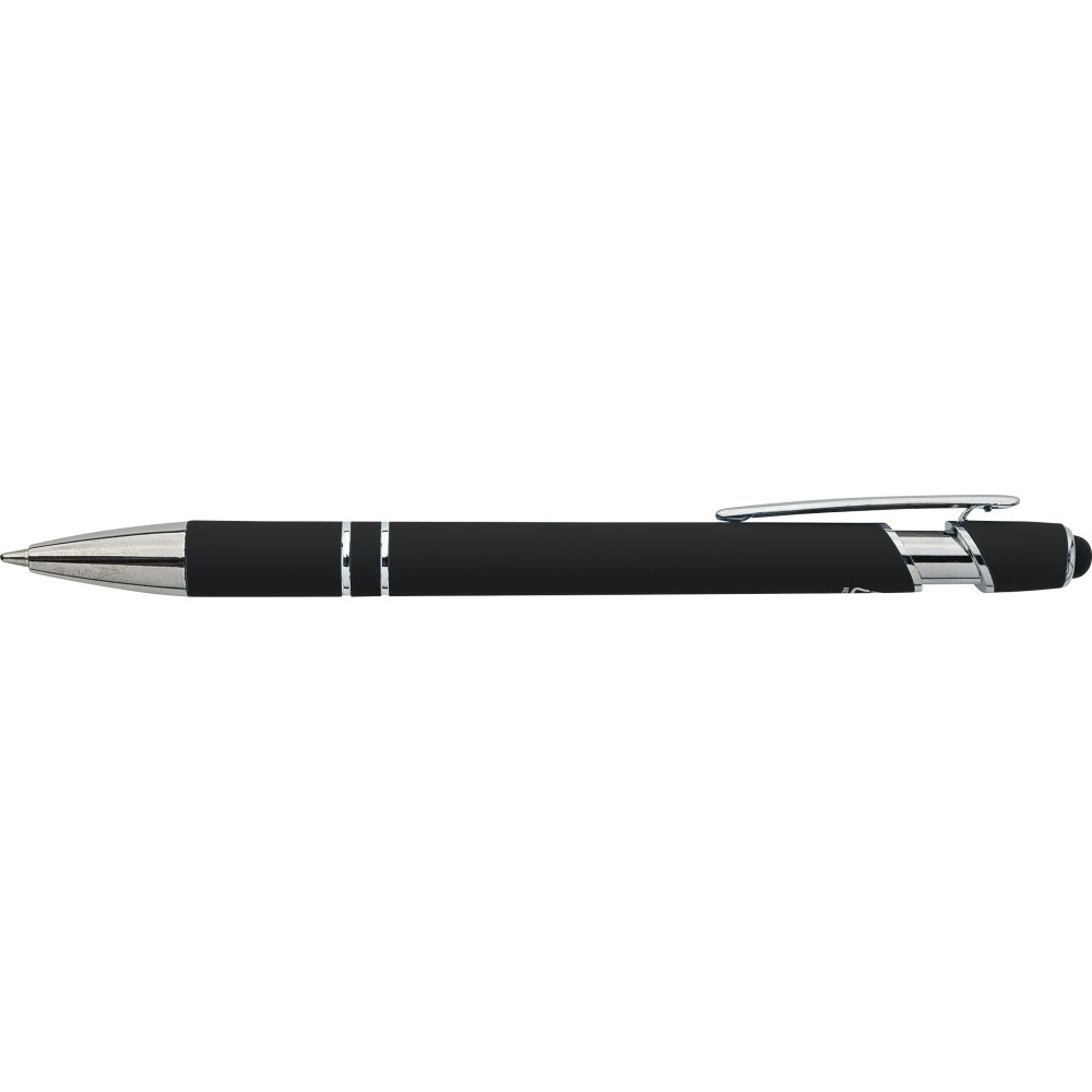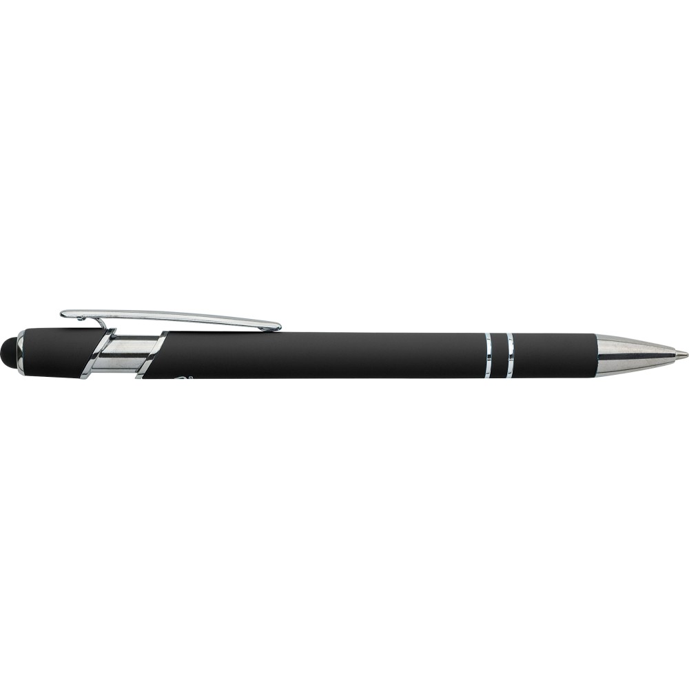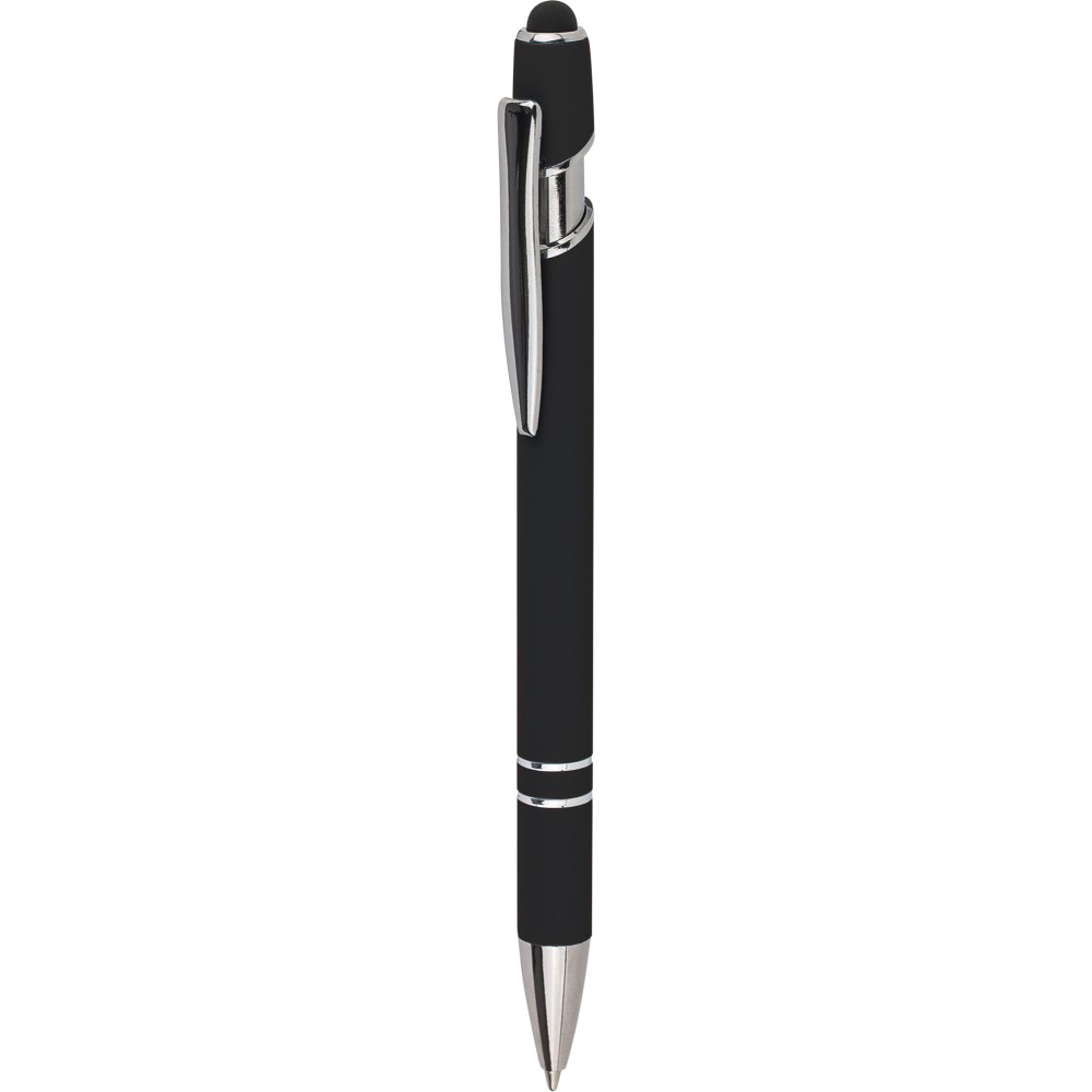 Újrahasznosított alumínium golyóstoll egyszínű, gumírozott felületű testtel és fekete, kapacitív érintőképernyőkhöz használható stylus véggel. Ezüstszínű kiegészítőkkel, nyomógombos szerkezettel és fekete tollbetéttel tervezve. A tolltesten gravírozott újrahasznosított logó található.