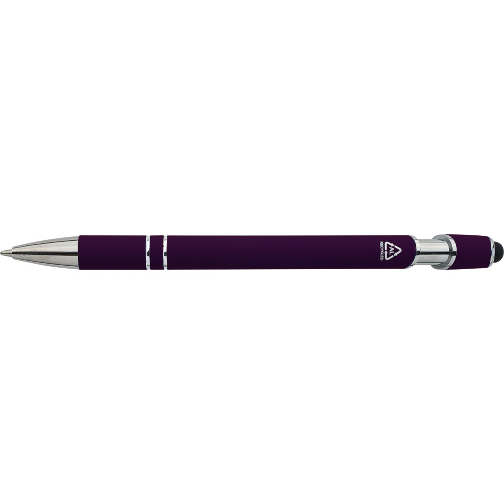 Újrahasznosított alumínium golyóstoll egyszínű, gumírozott felületű testtel és fekete, kapacitív érintőképernyőkhöz használható stylus véggel. Ezüstszínű kiegészítőkkel, nyomógombos szerkezettel és fekete tollbetéttel tervezve. A tolltesten gravírozott újrahasznosított logó található.