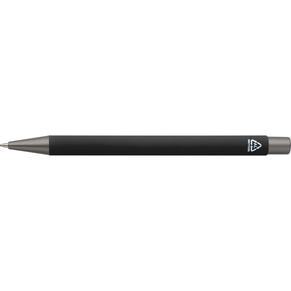 Újrahasznosított alumínium golyóstoll lágy tapintású gumírozott felülettel és kék tollbetéttel. Sötétszürke kiegészítőkkel és a bevonat alatti tükörhatású réteggel tervezve a látványos gravírozási eredmény érdekében. Nyomógombos szerkezettel és gravírozott újrahasznosított logóval.