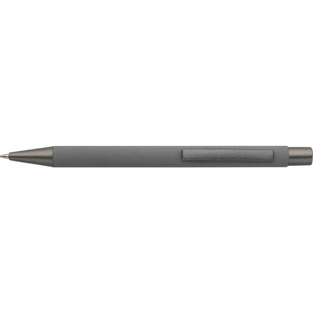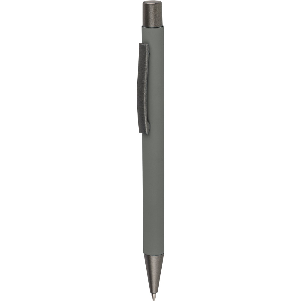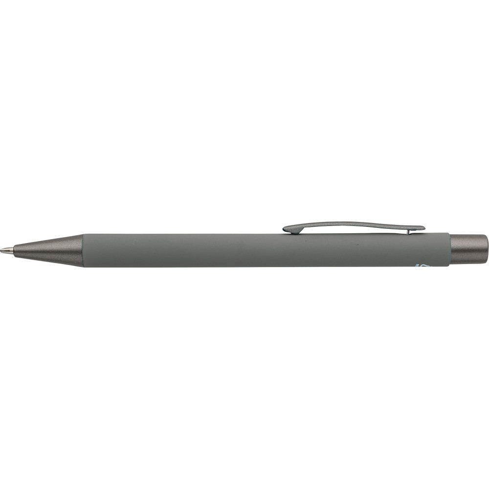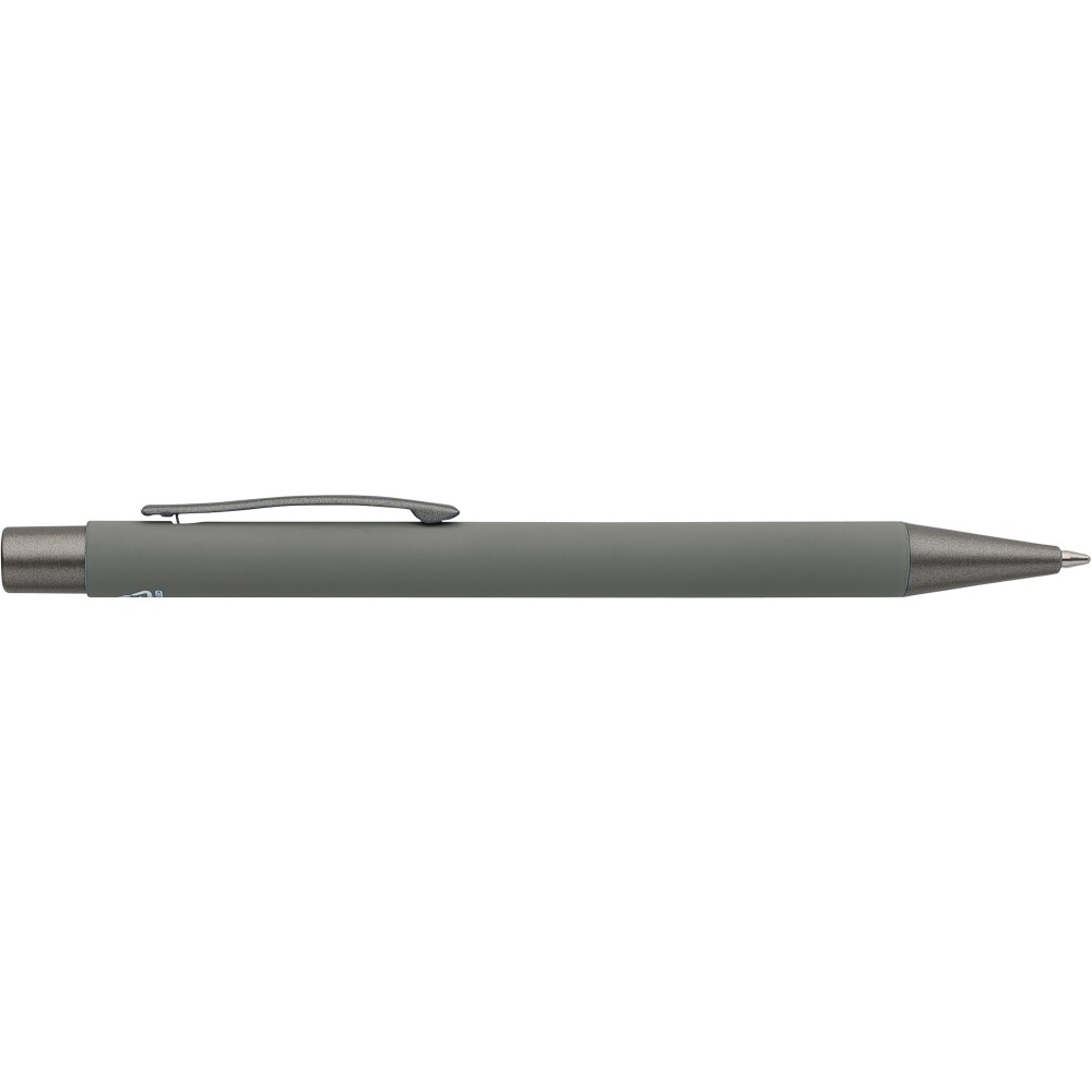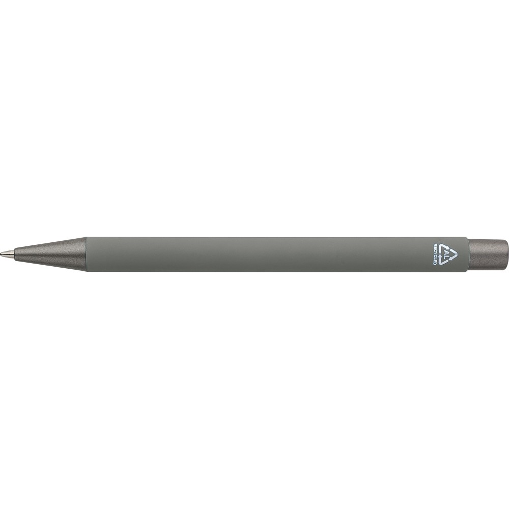 Újrahasznosított alumínium golyóstoll lágy tapintású gumírozott felülettel és kék tollbetéttel. Sötétszürke kiegészítőkkel és a bevonat alatti tükörhatású réteggel tervezve a látványos gravírozási eredmény érdekében. Nyomógombos szerkezettel és gravírozott újrahasznosított logóval.