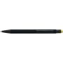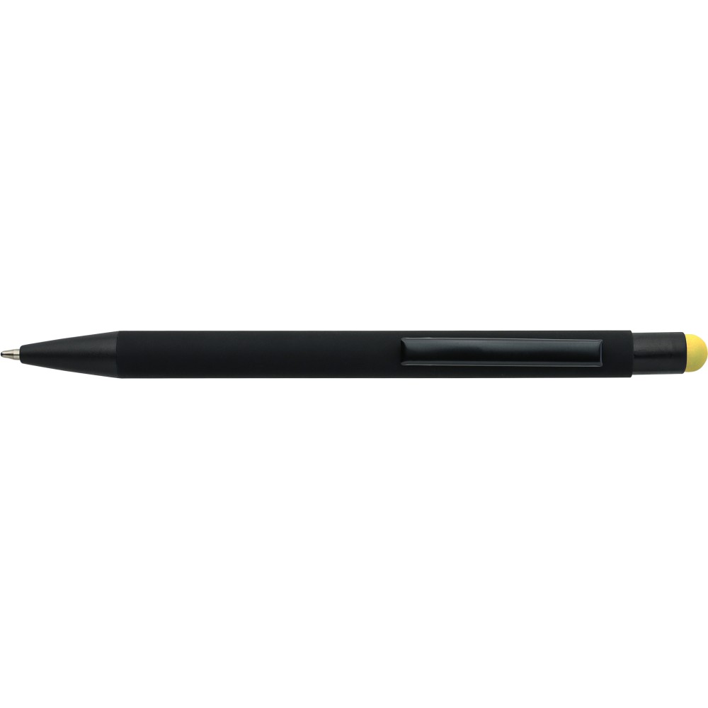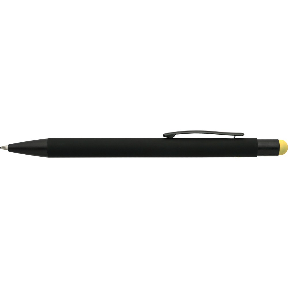 Újrahasznosított alumínium golyóstoll fekete, gumírozott felülettel és kék tollbetéttel. Színben illeszkedő kiegészítőkkel ? beleértve a belső tolltestet és az érintőképernyőkhöz használható stylus véget ?, amelyek kifinomult kontrasztot alkotnak gravírozáskor. Nyomógombos szerkezettel és gravírozott újrahasznosított logóval.