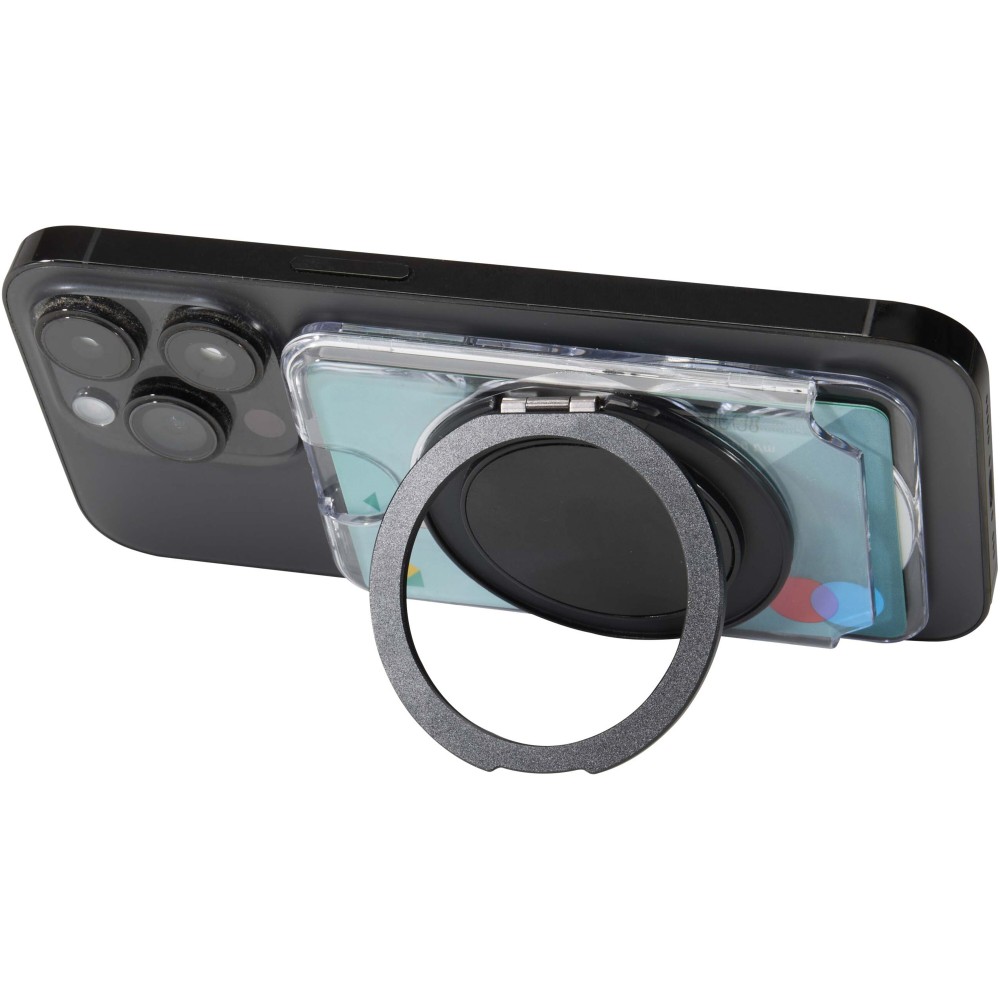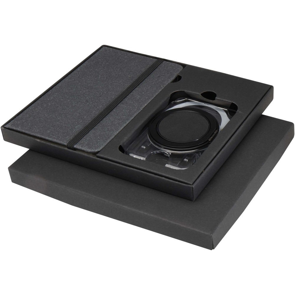 Praktikus ajándékszett, amely egy A6-os jegyzetfüzetet és egy MagSafe kártyatartót tartalmaz. A jegyzetfüzet sötétszürke, újrahasznosított műanyag borítással, 80 vonalas, krém színű, 70 g/m2 súlyú lappal és fekete gumis zárópánttal rendelkezik. Az átlátszó MagSafe kártyatartó egy kártya tárolására alkalmas, és mágnesesen rögzíthető az iPhone 12 vagy újabb modellekhez, de a csomag tartalmaz egy extra fémgyűrűt is a más típusú telefonokkal való használathoz. Mindkét termék elegáns, fekete karton ajándékdobozban érkezik.