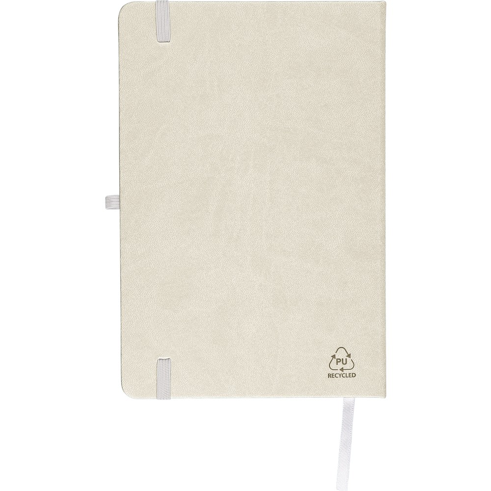A5-ös jegyzetfüzet újrahasznosított kemény PU borítóval, a hátoldalán dombornyomott újrahasznosított logóval. Tartós és rugalmas anyagból készült, amely kényelmes fogást, párnázottságot és hosszan tartó használatot biztosít. A borító lézergravírozásra alkalmas, amely során finom, tone-on-tone (színazonos) hatás érhető el. 80 vonalas, 70 g/m2 súlyú lapot tartalmaz, színben illeszkedő gumírozott rögzítőpánttal, könyvjelző szalaggal és tolltartó hurokkal. A füzetben használt papír FSC Mix tanúsítvánnyal rendelkezik.