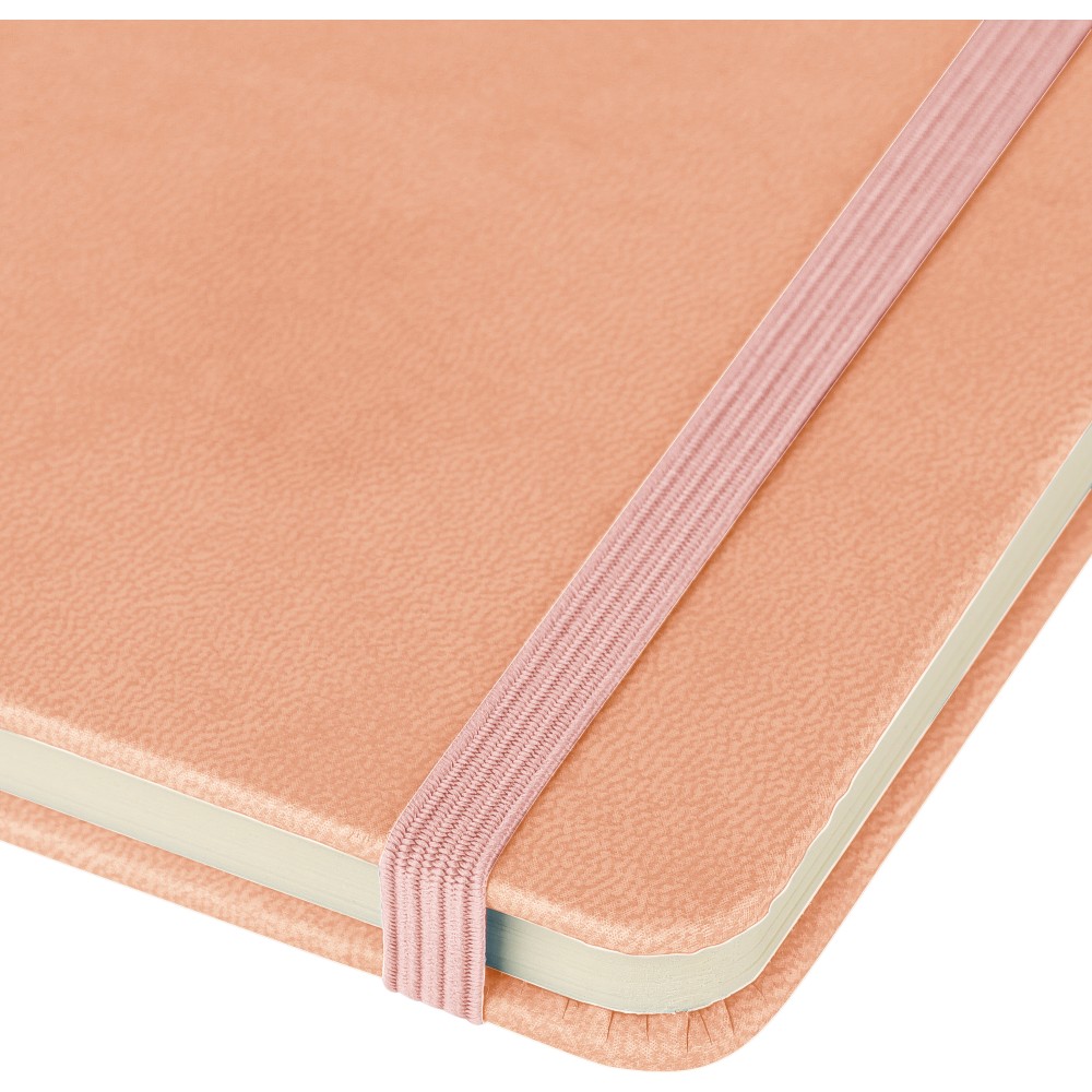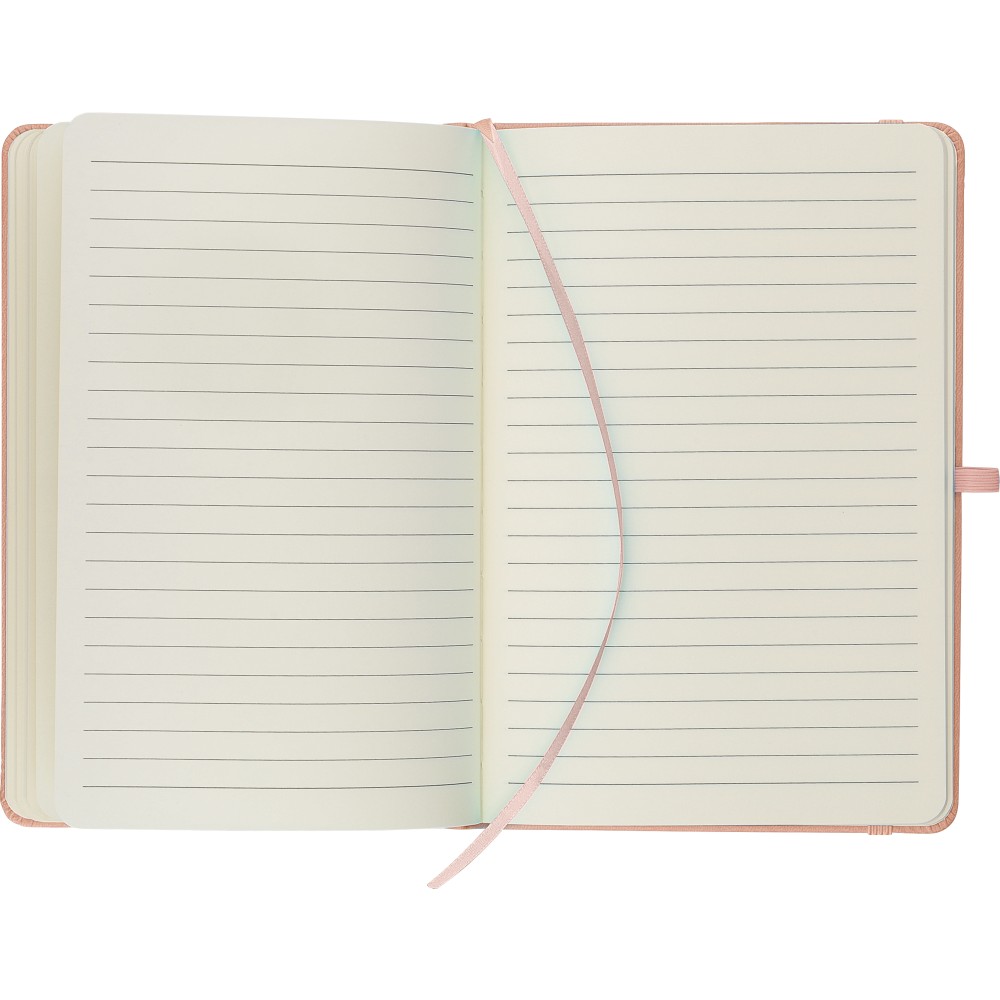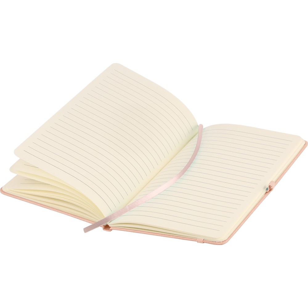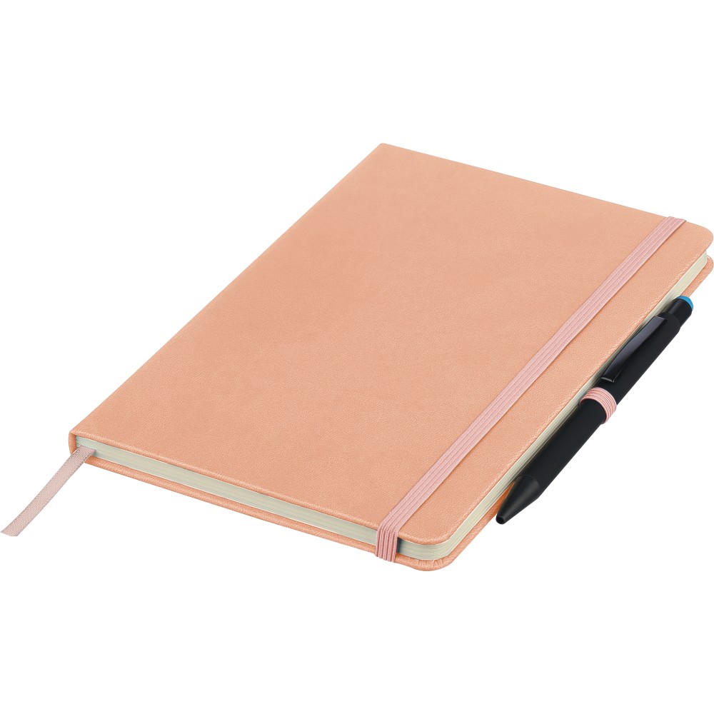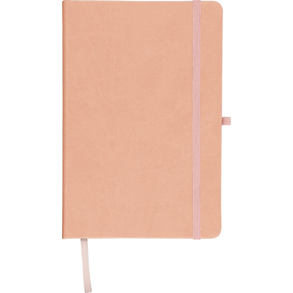 A5-ös jegyzetfüzet újrahasznosított kemény PU borítóval, a hátoldalán dombornyomott újrahasznosított logóval. Tartós és rugalmas anyagból készült, amely kényelmes fogást, párnázottságot és hosszan tartó használatot biztosít. A borító lézergravírozásra alkalmas, amely során finom, tone-on-tone (színazonos) hatás érhető el. 80 vonalas, 70 g/m2 súlyú lapot tartalmaz, színben illeszkedő gumírozott rögzítőpánttal, könyvjelző szalaggal és tolltartó hurokkal. A füzetben használt papír FSC Mix tanúsítvánnyal rendelkezik.
