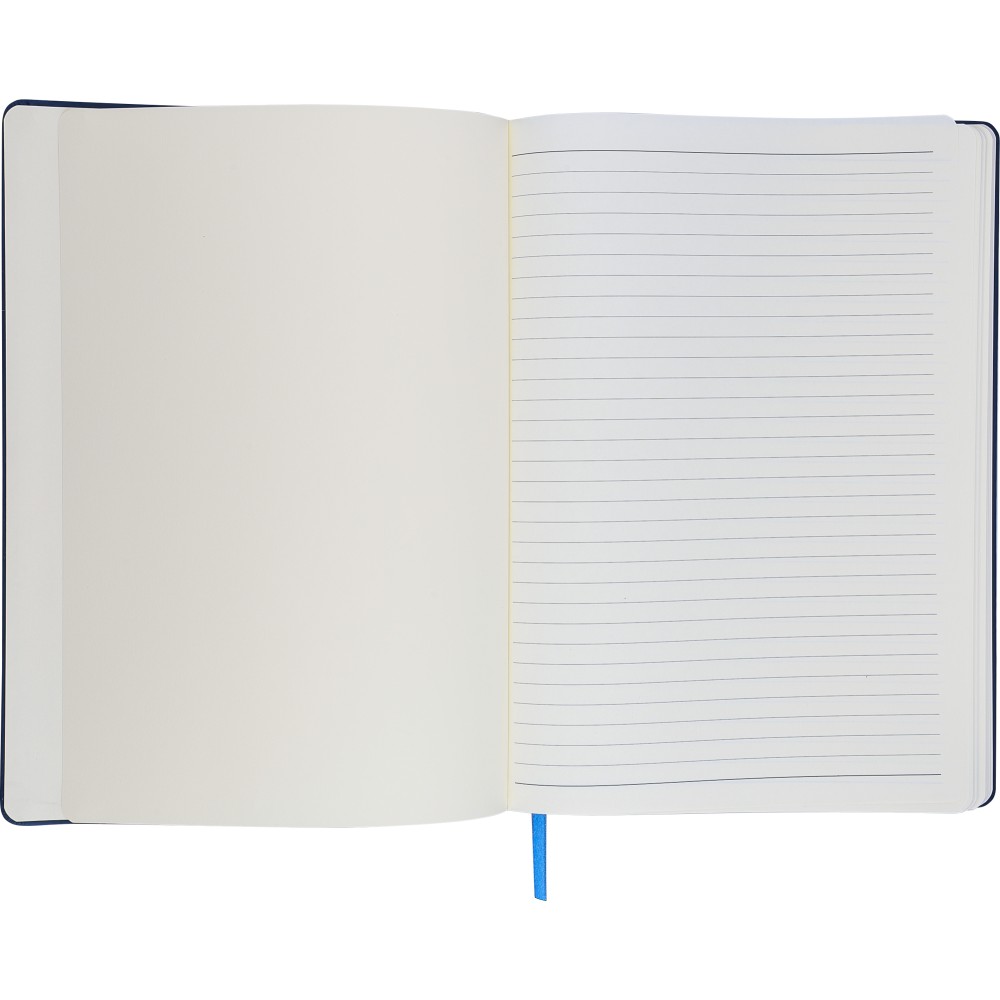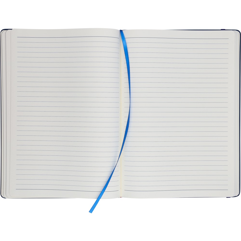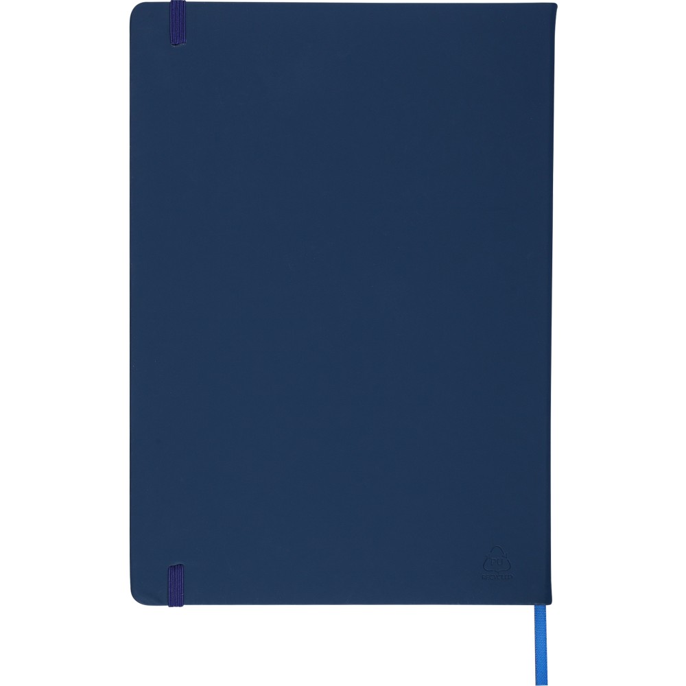 A4-es jegyzetfüzet élénk színű, újrahasznosított anyagból (PU) készült kemény borítóval. 96 db kétoldalas, vonalas lapot tartalmaz (6 g/m2), 0,7 cm-es vonalközzel, az elején és a végén két-két üres oldallal. A füzetben használt papír FSC Mix tanúsítvánnyal rendelkezik. Színben illeszkedő gumírozott rögzítőpánttal, beépített könyvjelző szalaggal és a hátoldalán dombornyomott újrahasznosított PU logóval ellátva.
