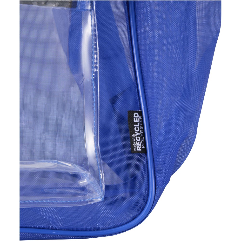 Ez az újrahasznosított poliészter hálóból készült hátizsák fenntartható választást kínál a praktikum és a stílus megőrzése mellett. A termék egy tágas, 18 literes főrekesszel rendelkezik a mindennapi alapfelszerelések számára, egy cipzáras elülső zsebbel a kisebb tárgyaknak, valamint két oldalsó zsebbel, amelyek ideálisak vizespalack vagy esernyő tárolására. A párnázott, állítható vállpántok biztosítják a kényelmes viseletet a nap folyamán. Az átlátszó hálós szerkezet letisztult, modern megjelenést kölcsönöz, miközben láthatóvá teszi a táska tartalmát, így tökéletes megoldást jelent olyan munkahelyeken, rendezvényeken vagy iskolákban, ahol előírás az átlátszó táska használata.