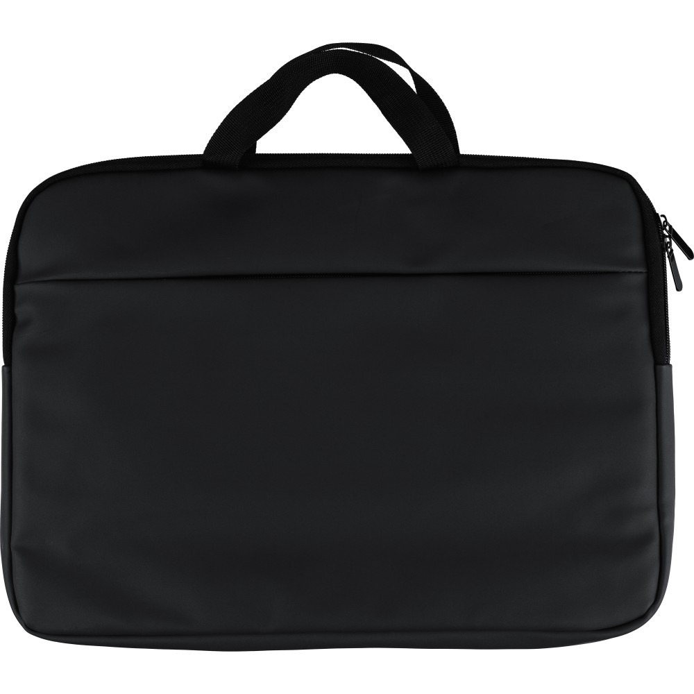 Újrahasznosított PU anyagból készült laptoptáska legfeljebb 15 hüvelykes készülékekhez, 4 mm vastag párnázással és 210D újrahasznosított béléssel. Elülső cipzáras zsebbel, hátoldali tépőzáras zsebbel, két rövid fogantyúval és állítható vállpánttal rendelkezik. A belső címkén újrahasznosított alapanyagra utaló logó található.
