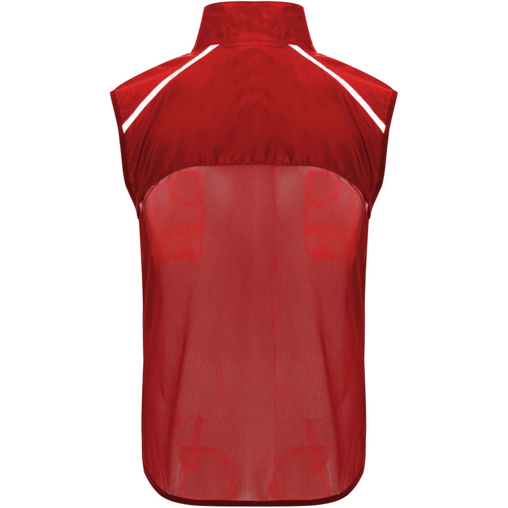 Szélálló és légáteresztő. Elülső cipzár azonos színű állvédővel. Rugalmas szegély a karkivágásnál és az alján. A hát alsó része mikroperforált anyagból készült. Fényvisszaverő csíkok a vállán. Zseb rugalmas pánttal, amelybe a mellényt el lehet csomagolni. Eltávolítható címke.