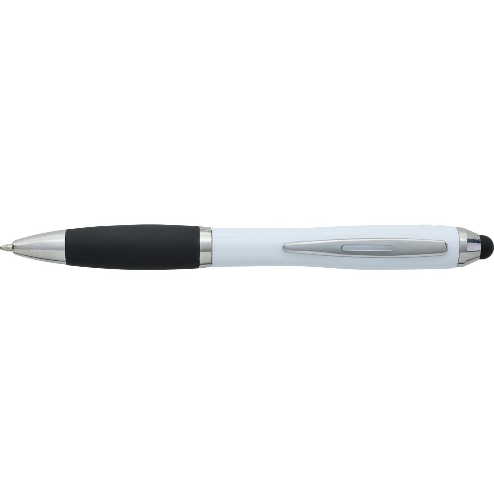 Golyóstoll egyszínű, gumírozott felületű testtel, ezüstszínű kiegészítőkkel és fekete, kapacitív érintőképernyőkhöz használható stylus véggel. Újrahasznosított ABS-ből készült. Nyomógombos szerkezettel, kék tollbetéttel és a tolltesten gravírozott újrahasznosított logóval rendelkezik.