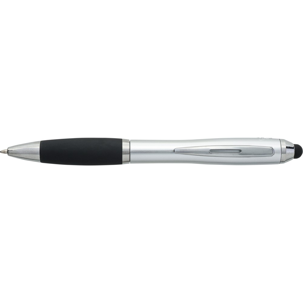 Golyóstoll egyszínű, gumírozott felületű testtel, ezüstszínű kiegészítőkkel és fekete, kapacitív érintőképernyőkhöz használható stylus véggel. Újrahasznosított ABS-ből készült. Nyomógombos szerkezettel, kék tollbetéttel és a tolltesten gravírozott újrahasznosított logóval rendelkezik.