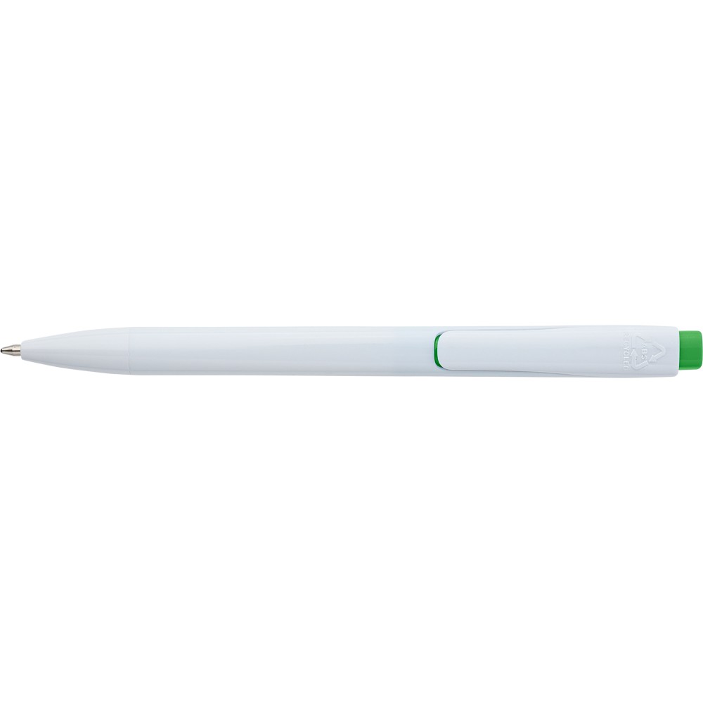 Golyóstoll tömör fehér tolltesttel és színes nyomógombbal. Újrahasznosított ABS-ből készült. Nyomógombos szerkezettel, klipsszel, valamint a nyomógomb tetején újrahasznosított ABS logóval rendelkezik. Kék színű, német Dokumental tollbetéttel, mely körülbelül 800 méter íráshosszt biztosít.