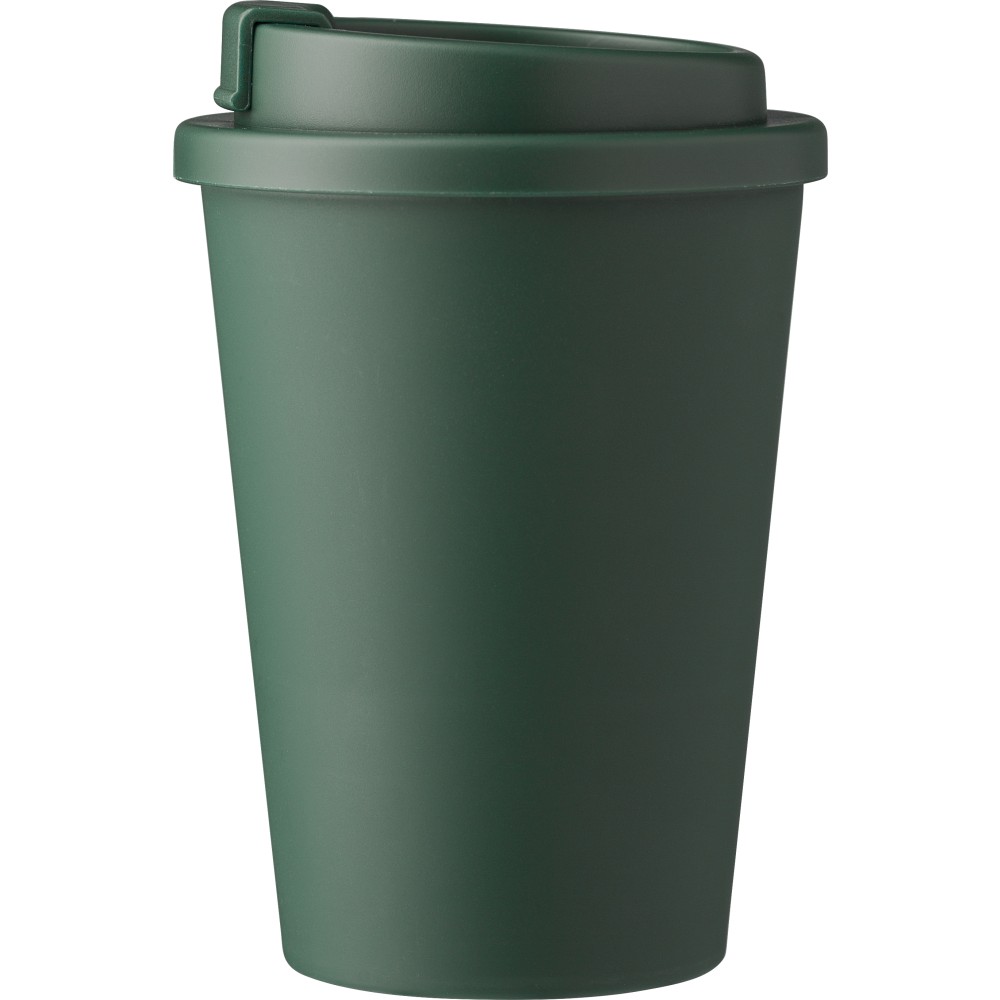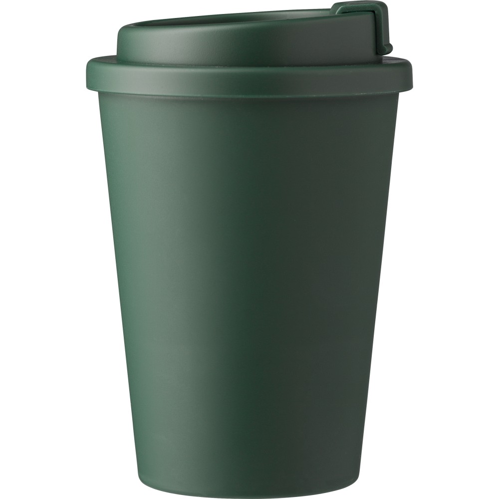 Kávéspohár csavaros fedéllel és felpattintható ivórésszel. Jó hőtartó, hideg és meleg italokhoz is használható. Űrtartalom: 350 ml. PP műanyag.