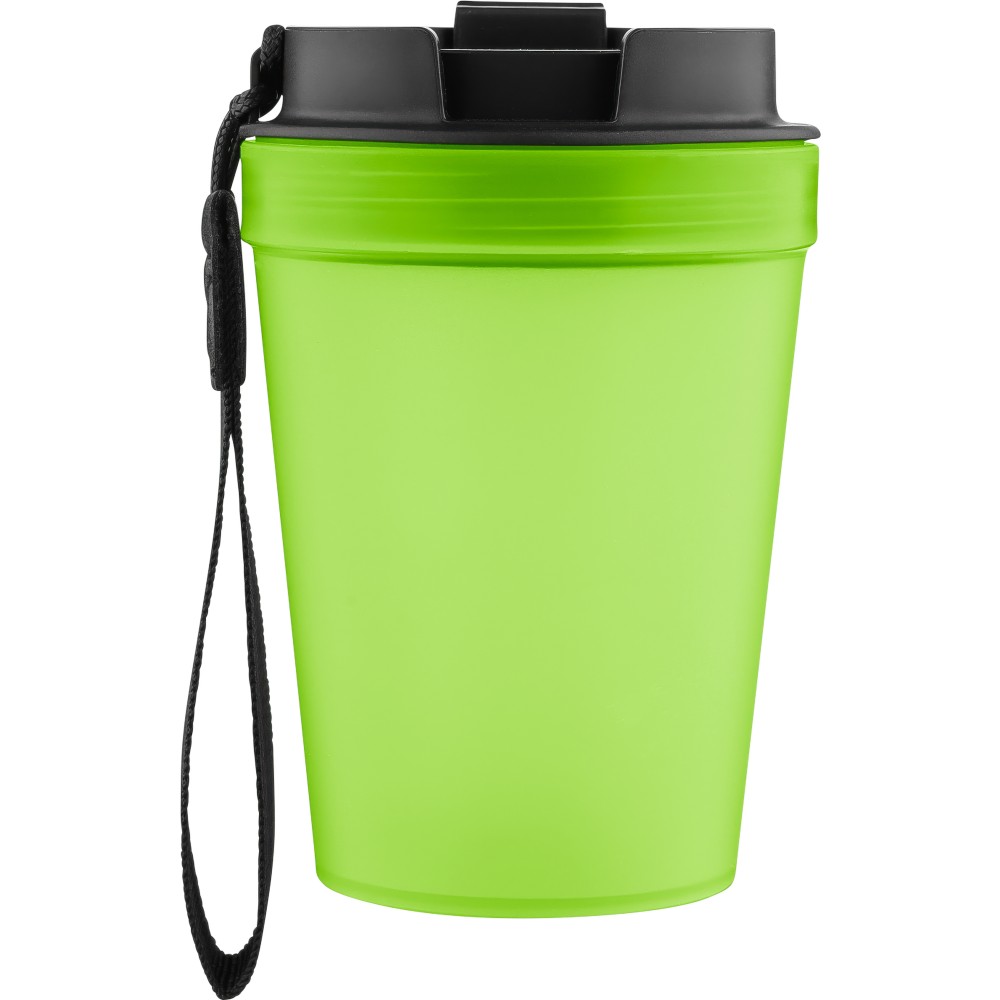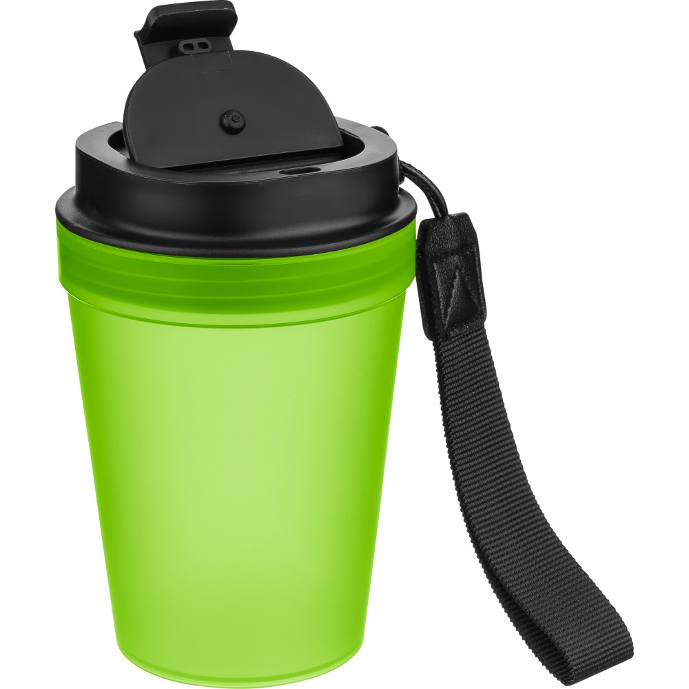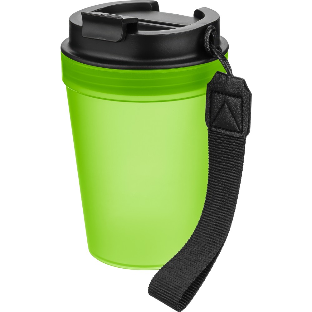 Átlátszó, szimplafalú ivópohár 350 ml-es űrtartalommal, vastagfalú kialakítással. Csavaros fedéllel és poliészter csuklópánttal rendelkezik a könnyű hordozhatóság érdekében. Tartós, ütésálló, megbízható termék. Meleg italokhoz is alkalmas, de kérjük, vegye figyelembe, hogy az egyfalú szerkezet miatt hőátadás előfordulhat.