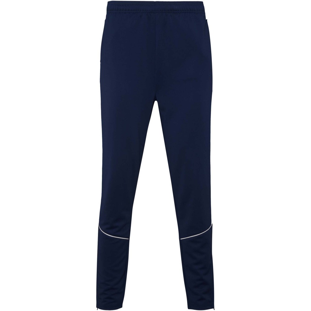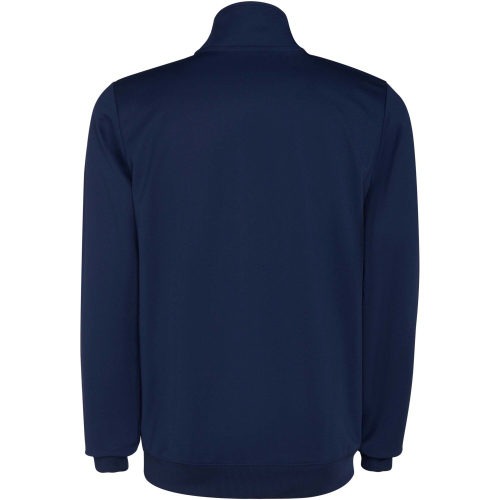 Könnyű és rugalmas anyagból készült melegítő. A végig cipzáros felső kontrasztos színű és varrású díszítésekkel dekorált a mellrészen. Oldalzsebek. Bordázott ujj- és és derékpasszé. Nadrág gumis derékkal és húzózsinórral, kontrasztos oldalsó varrással. Cipzáras szegély.