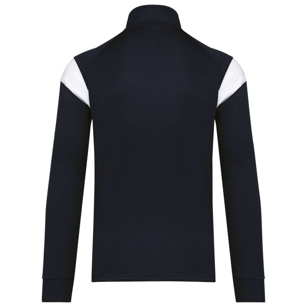 Anyaga: 100% matt poliészter interlock. Egyenes szabás. Elöl fordított cipzáras záródás színazonos nejlonból. Raglán ujjak kontrasztos vállbetétekkel. Kontrasztos mell- és vállkialakítás. Két cipzáras elülső zseb. Texturált anyagbetétek az oldalakon és a hátrészen. Cipzárfedő a felső nyakkivágásnál a nagyobb kényelem érdekében. Könnyen eltávolítható márkajelzés a dekorációhoz.