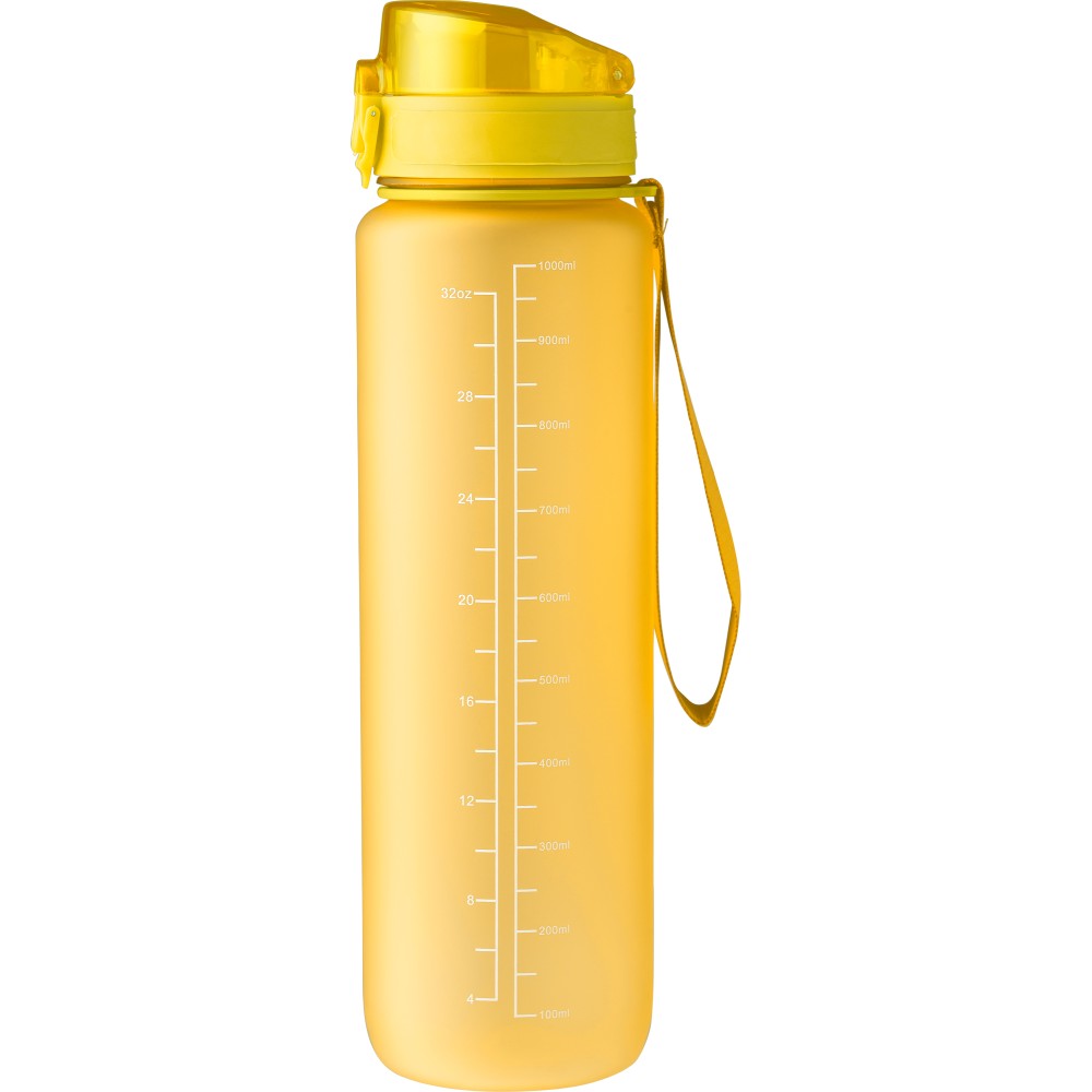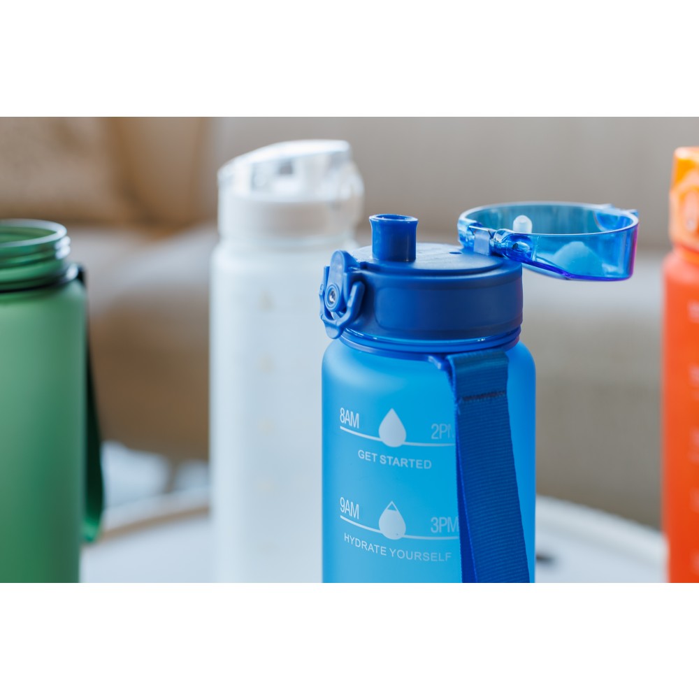 Műanyag motivációs palack szivárgásmentes kupakkal, csuklópánttal, matt bevonattal. Oldalán beosztással. Űrtartalom: 1 liter.