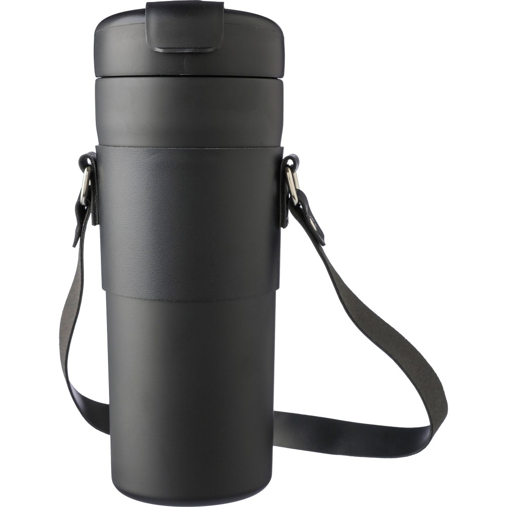 Duplafalú palack PU hordozótokkal, szívószállal és pánttal. A belső rész 304-es rozsdamentes acélból, a külső rész 201-es rozsdamentes acélból készült. PP fedél nyomógombbal a kifolyó nyitásához vagy zárásához, valamint külön ivónyílással. A tartalmát 6 órán át melegen és 10 órán át hidegen tartja. Egyenként barna kartondobozba csomagolva. Űrtartalom: 730 ml.