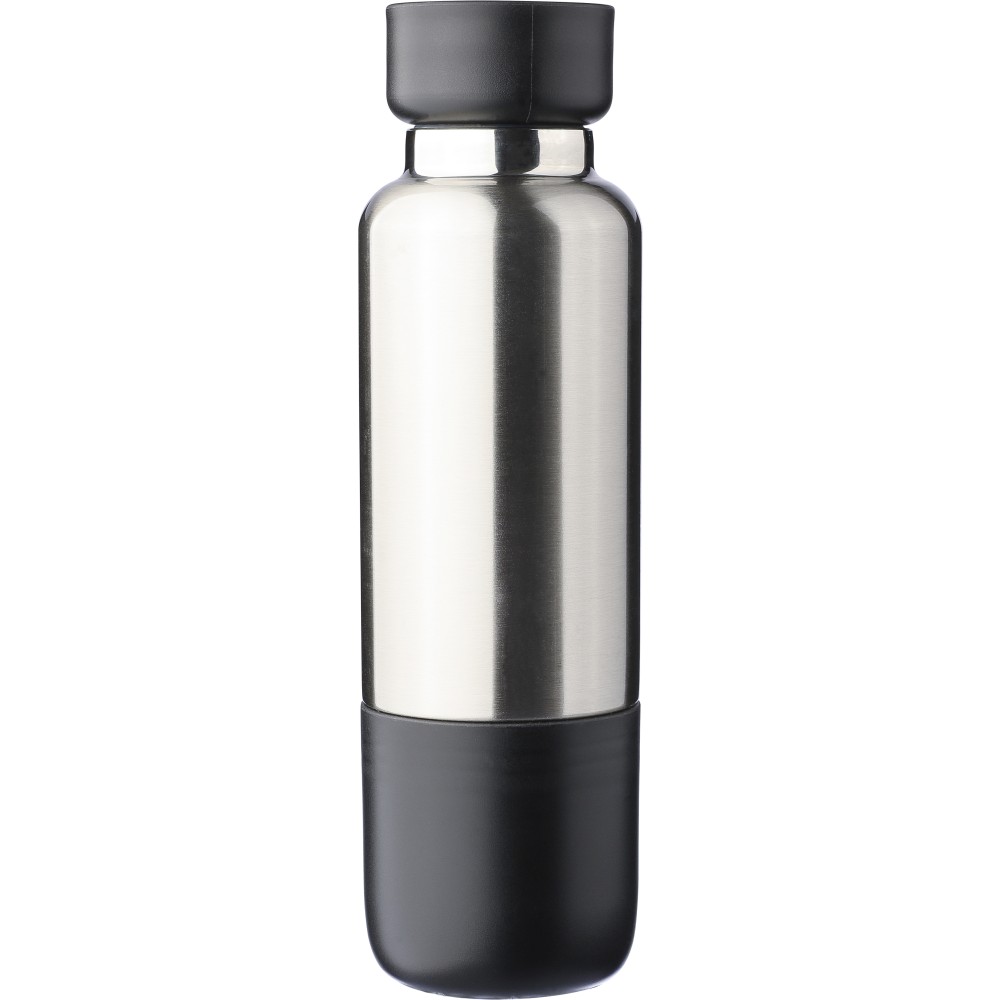 Duplafalú rozsdamentes acél kulacs, 500 ml-es. 304-es rozsdamentes acél belsővel és 201-es rozsdamentes acél külsővel. Átlátszó rekesszel ellátott PP csavaros kupakkal, cserélhető poliészter csuklópánttal, valamint egy 200 ml-es PP pohárral az alján. Ezüst színű felület matt részletekkel. Csomagolása barna papírdoboz.