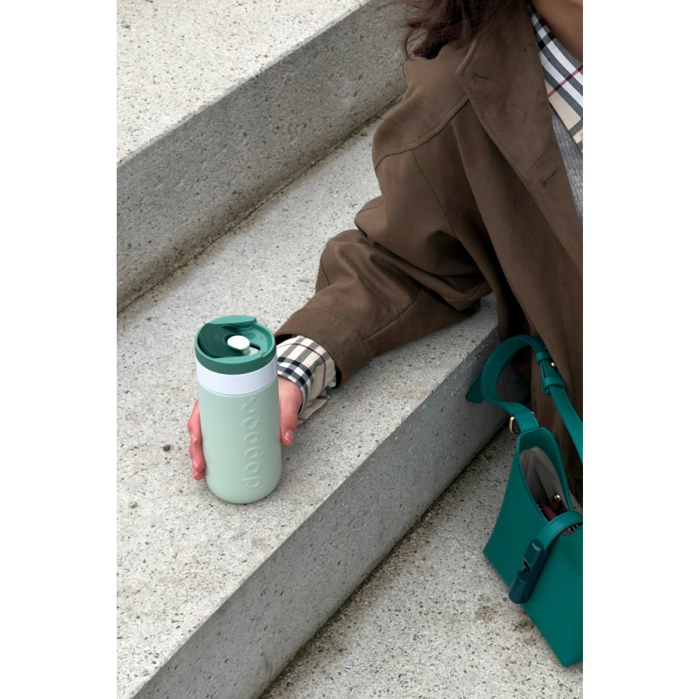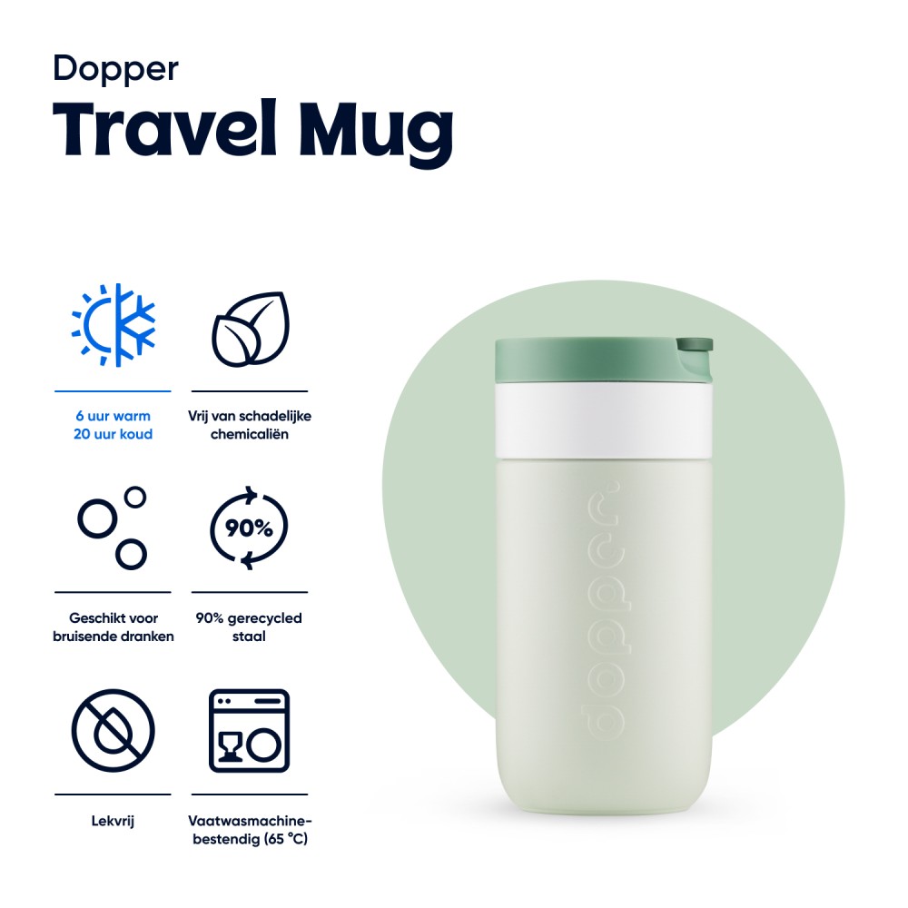 Legyen szó reggeli kávéról, napközbeni hidratálásról vagy egy esti szénsavas italról, ezt a Dopper Travel Mug-ot úgy tervezték, hogy mindenre alkalmas legyen. A meleg italokat akár 6 órán át melegen, a hideg italokat pedig 20 órán át hűvösen tartja. Duplafalú, 90%-ban újrahasznosított rozsdamentes acél testtel és tartós bevonattal készült. A könnyen nyitható, lepattintható kupak egyszerűvé és kényelmessé teszi a használatot útközben is. Mosogatógépben (emblémázás nélkül) 65 °C-ig tisztítható. Kérjük, vegye figyelembe, hogy kávé vagy tea használata esetén elszíneződés vagy szagmaradvány előfordulhat. Forró italok fogyasztásakor járjon el óvatosan!