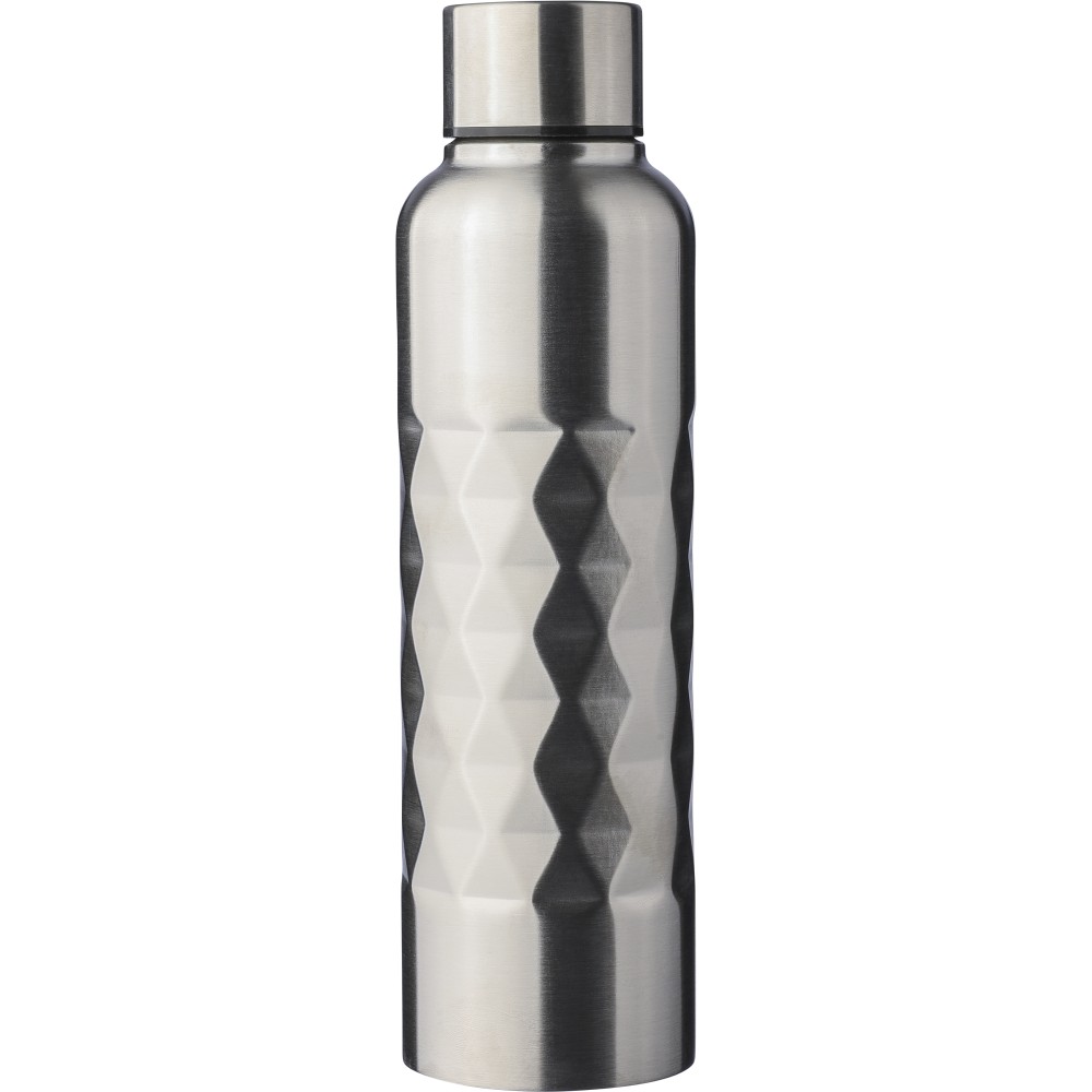 Újrahasznosított 304-es rozsdamentes acélból készült szimplafalú kulacs, 800 ml-es. Gyémánt alakú textúrával a testen, csavaros tetővel és lézergravírozott újrahasznosított logóval. Egyenként csomagolva, barna kartondobozban.