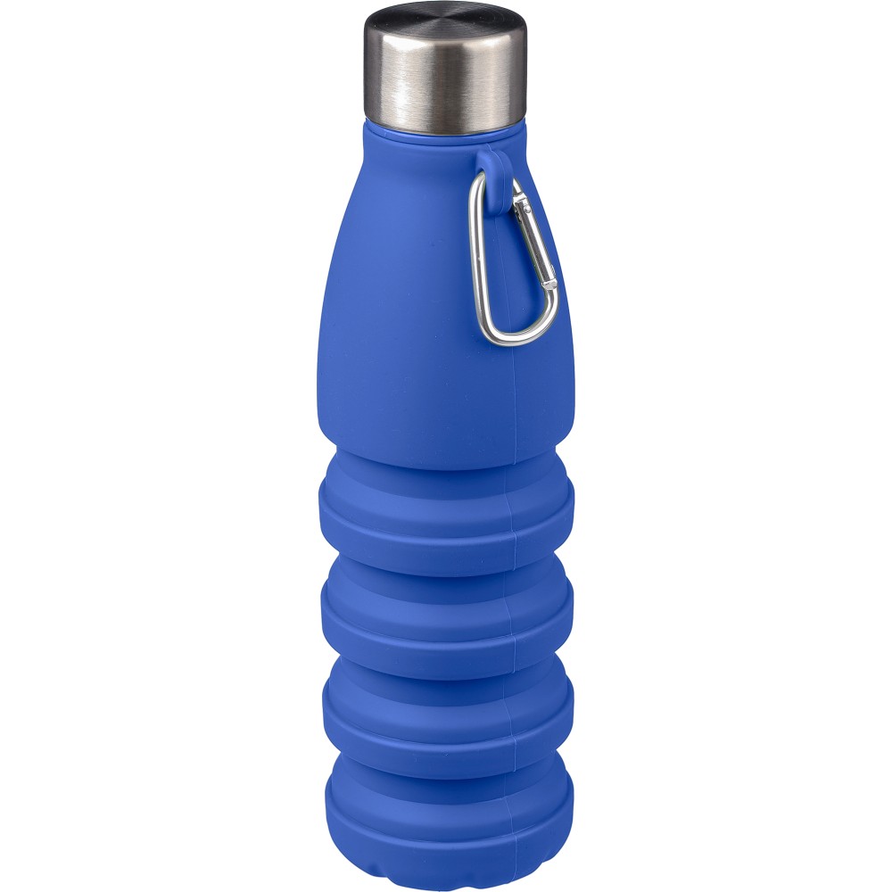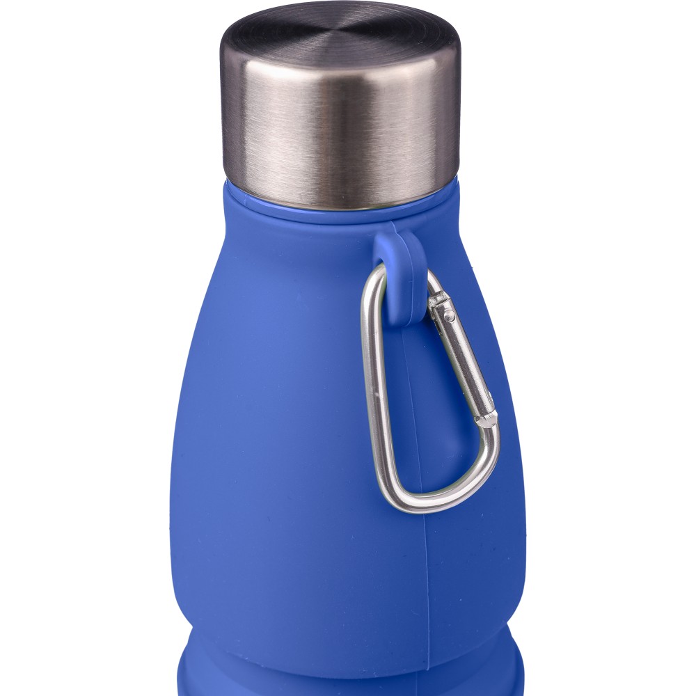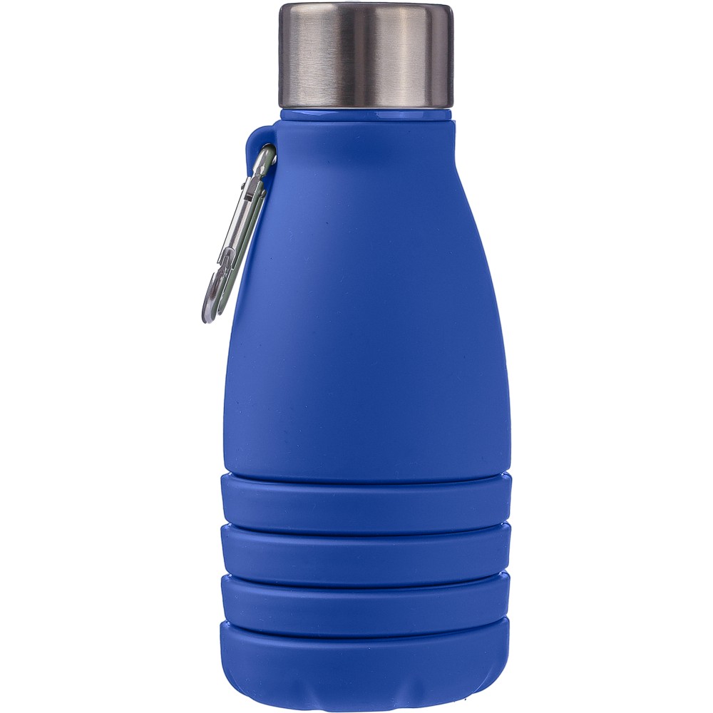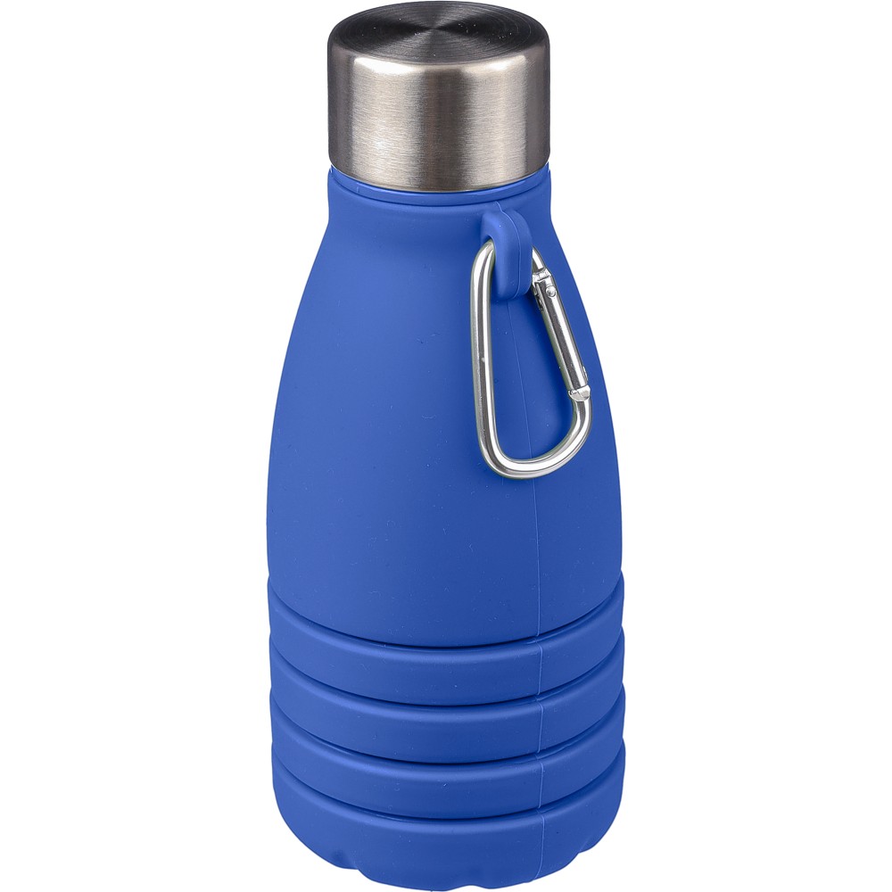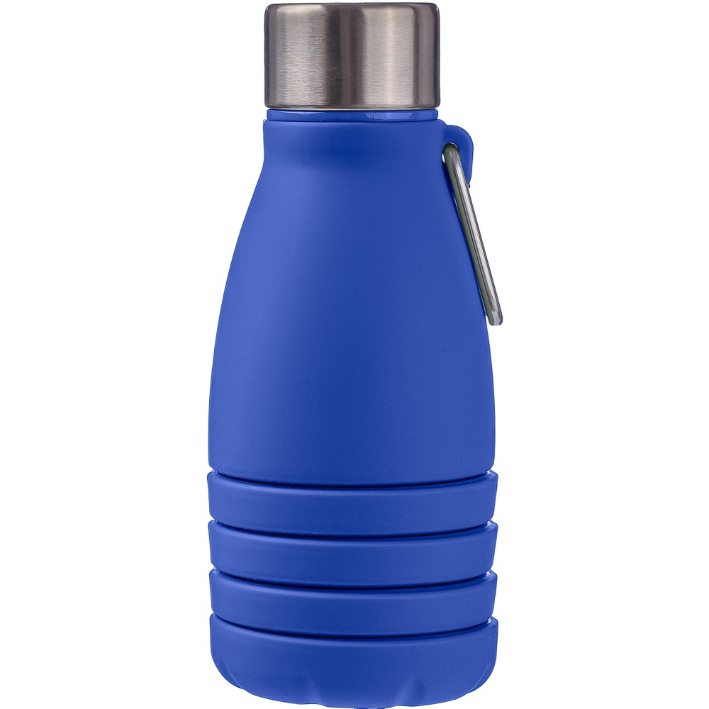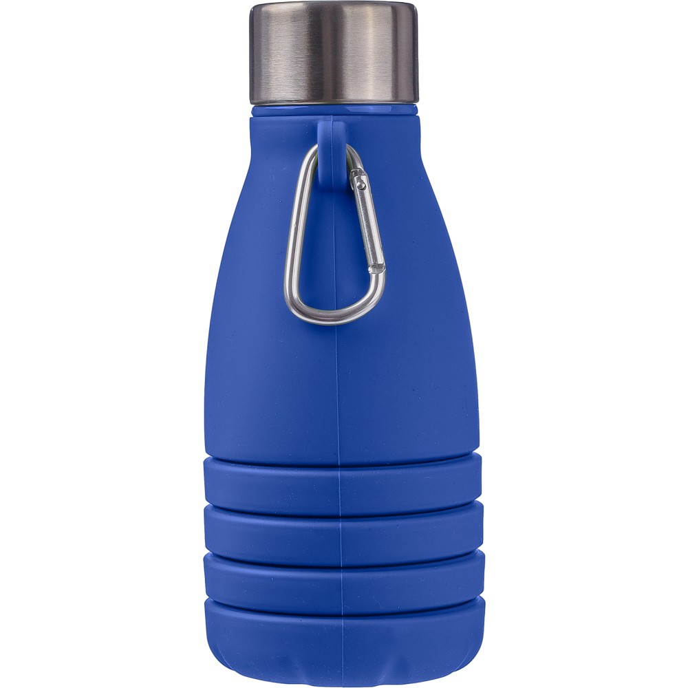 Összecsukható palack rozsdamentes acél fedéllel és alumínium karabinerrel. Összecsukott méret: d: 7x17 cm, kinyitott méret: d: 7x25 cm. Nincs egyenként csomagolva. Anyaga: szilikon. Űrtartalom: 550 ml.