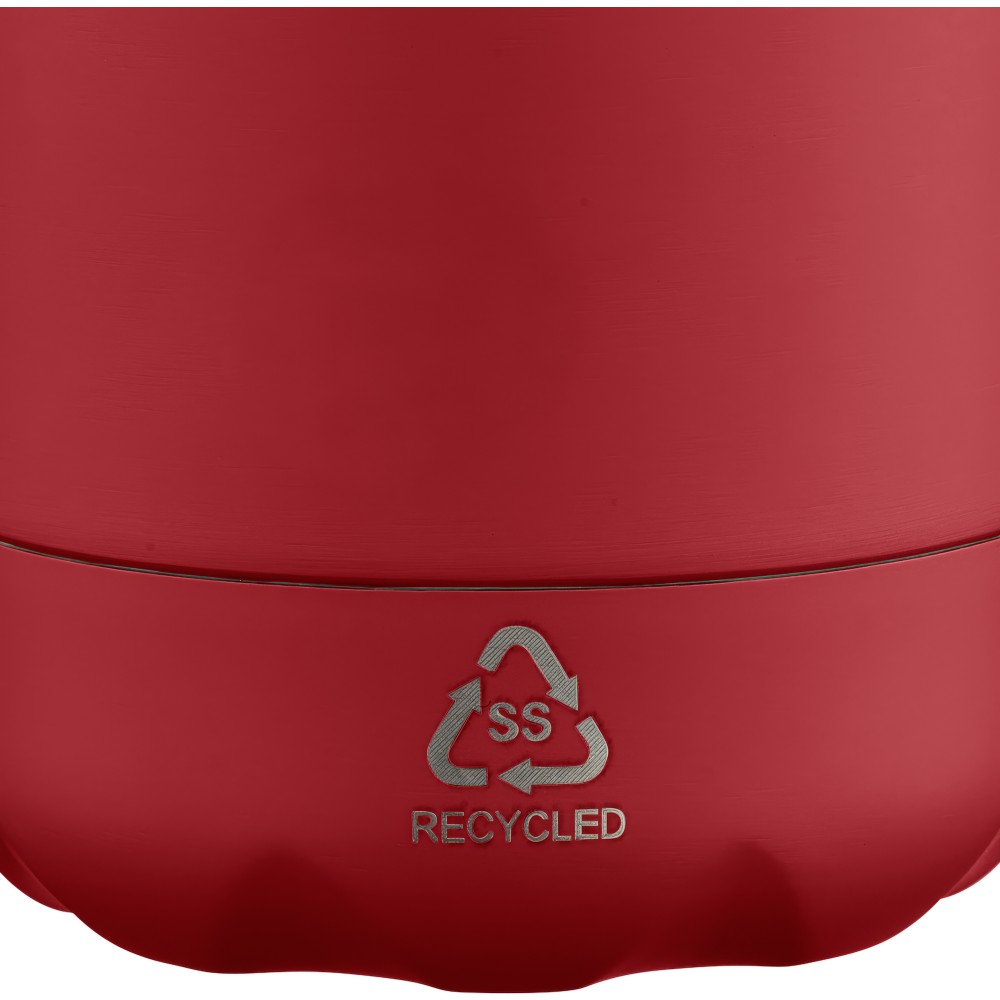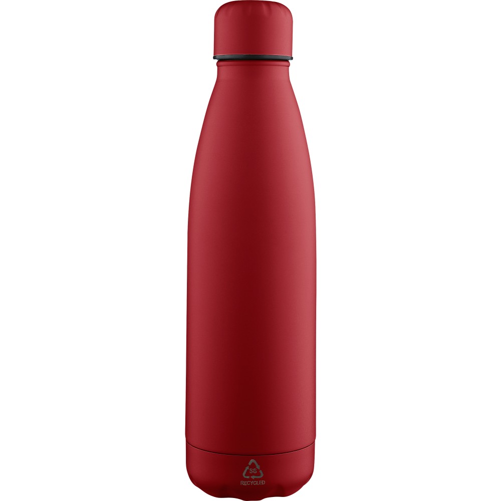 Újrahasznosított rozsdamentes acél, egyfalú ivópalack 700 ml-es űrtartalommal. Hideg italok tárolására alkalmas, és 3-4 órán át hűvösen tartja azokat. A 304-es rozsdamentes acél belső kiváló tartósságot, rozsdaállóságot és biztonságos élelmiszer-érintkezést garantál. Matt színű felülettel, valamint színben illeszkedő csavaros fedéllel és aljjal. Az elülső oldalon gravírozott újrahasznosított logó található. Egyenként barna kartondobozba csomagolva.