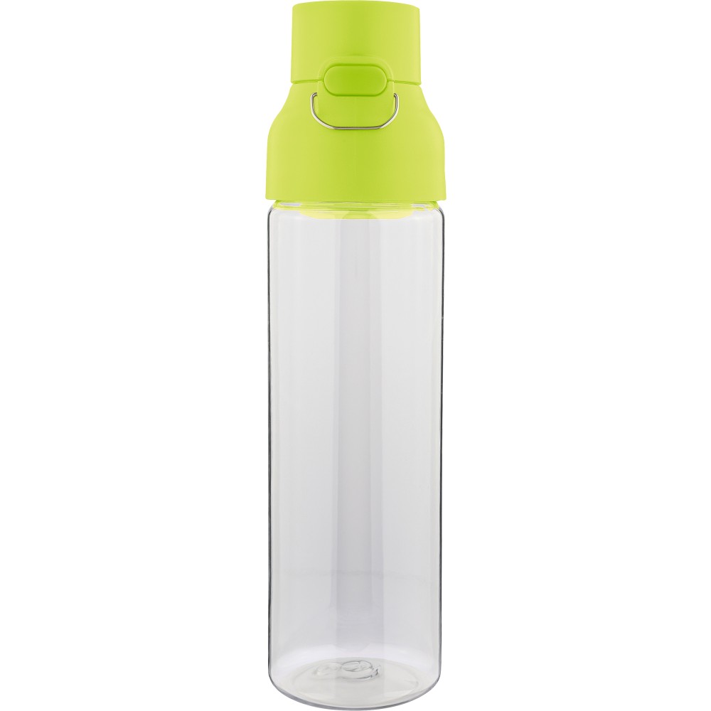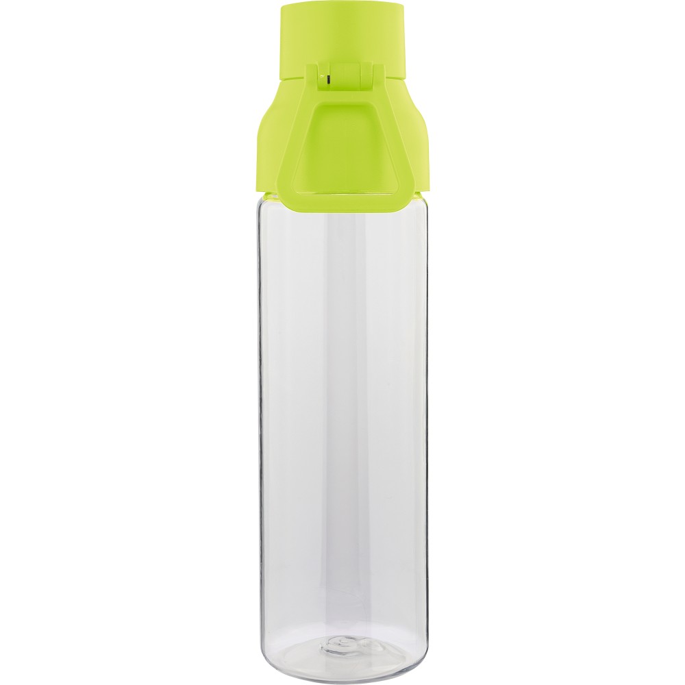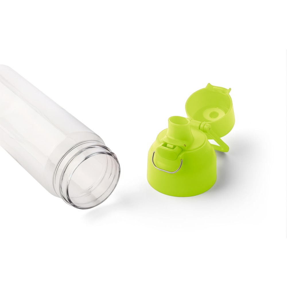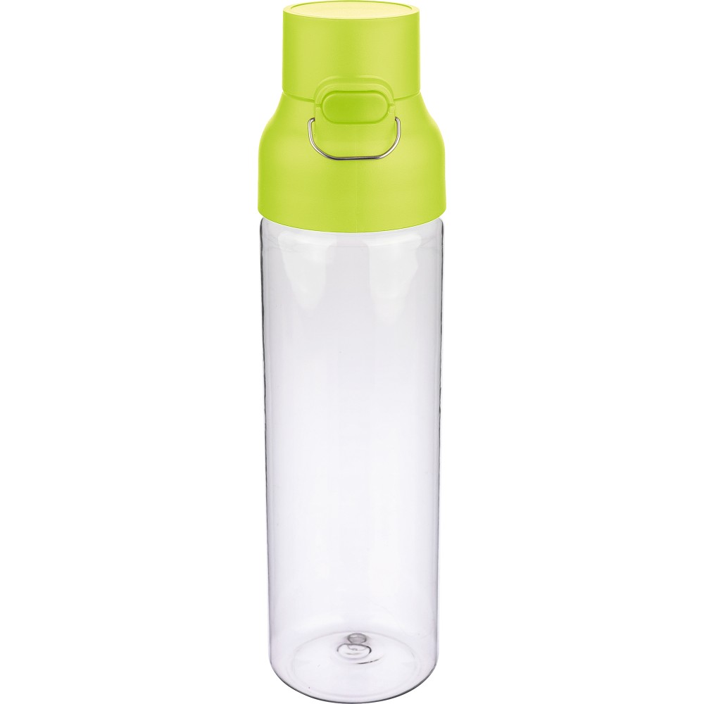 Tritán vizespalack 750 ml-es űrtartalommal, átlátszó palacktesttel és színes kupakkal. Tartós és könnyű anyagokból (PP) készült, amelyek ellenállnak a nedvességnek, a vegyszereknek és a mindennapi igénybevételnek. Mindennapi használatra tervezve; biztonságos nyomógombos zárral és felső hordozófogantyúval rendelkezik. Alkalmas munkához, iskolához vagy szabadtéri tevékenységekhez.